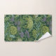 Seamless William Morris style wallpaper pattern featuring dense green foliage and large, rounded flowers in shades of lime green, off-white, and muted lavender against a dark emerald background.