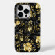 Seamless pattern with black and gold blooming orchids, richly decorated with black eucalyptus twigs and delicate jewellery pistachio twigs on black background. Golden jewellery Orchid.