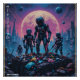 Search Squad Ω drops you straight onto a drifting junk planet where retro-futuristic robots sift through neon debris under a rain-soaked sky. Tattered space suits, glitch-lit skylines, and a battered mix of color and chaos give this piece the look of a lost Japanese sci-fi poster from an alternate 1980s.