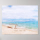 "Seas the Day" typography written quote in the sand of this captivating scene of a beached fishing boat on a sandy beach with watercolor aqua blue ocean,and sunny sky above.
