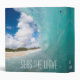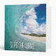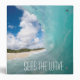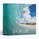 "Seas The Wave" saying on the aqua blue ocean wave tunnel of Haleiwa, Hawaii as it's crashing ashore the beach. Blue sky and Hawaiian island backdrop.
