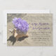 Pretty purple hydrangea fills a tropical beach conch shell in the sand, photograph style beach wedding invitation with custom text, accented in purple.