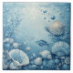 Bring the serenity of the sea home - one tile at a time. Inspired by the natural beauty of marine ecosystems, this tile features flowing aquatic fish silhouettes gliding through a sea of shimmering bubbles. Intricately rendered seashell motifs anchor the design, adding textural richness and symbolic coastal charm. The interplay of soft oceanic tones, seafoam, aqua, cerulean, pearlescent highlights with sunlight filtering underwater marine life creates depth and movement, making the tile feel alive and involved. Brighten up your interiors while bringing the sea inside, swim with your dreams in blue ocean ripples.