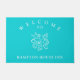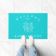 Turquoise shell art welcome mat with business or family name template. White on tropical blue colour with curved text at the top and name, or any text along the bottom.