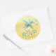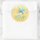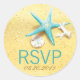 Aqua starfish, coquillage, corail et dollar de sable sur plage de sable étiquette RSVP pour un mariage de destination plage.