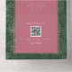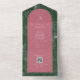 White line art illustration of palm leaves pattern over dark green background with white text and seashell design over pink arch with yellow border. Outside is pink with return address and palm leaf illustration on flap. Rsvp features qr code.