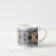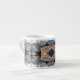 This artwork on this Espresso Cup was made from an original photograph by HomeWare of sea shells. It is a photo of several shells in bright sunlight and shadow. The sea shells are conch and other varieties, mostly white and cream coloured, but one with a light salmon colour on the interior of the shell, and one with black and white stripes. There are many intricate, curving shapes in the design made from the sea shell photo. The overall tone of the pattern is shades of warm grey and white, with a dash of pale salmon pink.