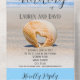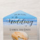 A unique wedding invitation featuring a seashell that has a natural heart shape. A perfect symbol of love for the celebration of love. The shell is surrounded by sand with ocean waves in the distance creating the perfect image for the beach theme wedding.