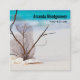 Business cards with a gorgeous photograph. Tropical blue water and foamy surf in the background. A collection of seashells and stems set on a white sandy beach.