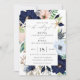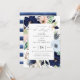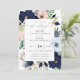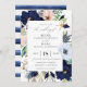 Watercolor flowers and foliage in trendy shades of navy, blush, dusty blue and taupe with starfish and seashell accents, elegant wedding invitation. Card features, white and navy blue watercolor stripe pattern backing.