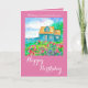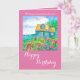 A pretty happy birthday greeting card featuring a little blue cottage by the sea with a sailboat in the water and bright red sweet peas in bloom mingling with lupines and pink wildflowers on a summer day drawn with sepia ink and painted with watercolor.
