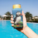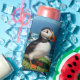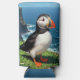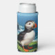 A sweet puffin can cooler that has a cute illustration of a puffin sitting by the sea on an seaside dune or ledge.