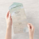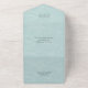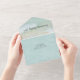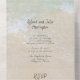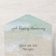 Fiftieth, or any year, anniversary ceremony invitation with detachable reply card. This all-in-one invitation design has a seashore, beach and surf, background, with a big white sand dollar at the bottom. A modern hand-printed font is used with three places for addressing the card on the outside. Include a mail-to, return address, and address to return the RSVP. If an outer envelope is being used, remove all unneeded address text. A stamp can be added to the reply card so guests can simply fill in names and response info and drop it into the mail. The menu reply can be changed to a simple “will attend” and “will not attend”. Although the sample text is for a wedding anniversary, the main invitation text template is in paragraph form and can be easily changed for a wedding or other coastal themed event. The outside graphic is sea blue.