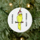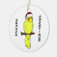 Cartoon Cockatiel ornament has a cartoon lutino wearing a red Santa hat, perched on a branch. The text reads, "Season Greetings." Perfect for parrot owners!