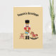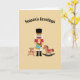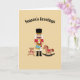 Beautiful holiday card with nutcracker, a teddy bear and rocking horse and customize / personalize text