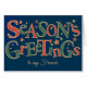 A stylish Christmas card for a Fiancee, with 'Season's Greetings' in red and white and dark green and white polka dot lettering, outlined in gold-effect on a deep blue background and scattered with gold-effect and red stars. You can easily change the inside message on this text-based digital design by Judy Adamson and if you can't find a card for the person you want to send it to, there is a custom-front version you can personalise.