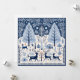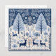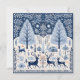 A beautiful illustration of a woodland scene with deer, trees, and animals in a blue colour palette, Scandinavian-inspired artwork, detailed foliage patterns, traditional Nordic motifs, and a rustic wooden house visible in the background. A decorative border forms around all the elements. The design includes features such as deer antlers, wildflowers, leaves, fireflies, stars, and animal footprints. A beautiful design for all your Christmas festivities!