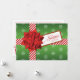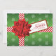 This inexpensive and festive green, red and white simulated wrapped gift box "Season's Greetings" Christmas or Holiday card has a green wrapping paper look background with whimsical white snowflakes on it. There are red and white diagonally striped ribbons wrapped around the front with a big red metallic type gift bow and matching gift tag. This fun card would be perfect for a company, business, or corporation to send out in bulk to their customers and/or employees or for anyone to send to family and friends. If you require any matching items, such as an envelope, postage, or envelope seal, please email niteowlstudio@gmail.com with your request.