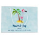 A large gift bag with the text: Seasons Greetings. A whimsical drawing of a pink flamingo wearing a red santa hat. Standing on a mound of yellow beach sand with a green and brown coconut palm tree in the back. Light blue background with a faint polygonal pattern. Cute and fun festive tropical design.