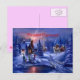 blue christmas scene with red seaons greetings! script on front. light pink background on flip side with bellarouge logo at the bottom.