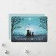 Two dogs and cat silhouette watching the sunset on a winter evening. In colours of blue, black and white. With two trees on both sides and birds flying towards the sunset. Snowflakes falling and a couple of bright stars in the sky. Winter scenery Original Acrylic Painting Art done by Donna Leger for Irony Designs. All Rights Reserved
