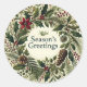 Add a touch of elegance to your holiday gifts, cards, and decor with this beautifully illustrated round sticker featuring a festive wreath. The design showcases a lush arrangement of holly leaves, pinecones, berries, and evergreen sprigs encircling the text "Season's Greetings." With its rustic charm and intricate botanical details, this sticker is perfect for holiday envelopes, gift wrapping, or seasonal crafts. Celebrate the warmth of the season with this timeless and versatile design.