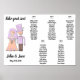 Elegant bride and groom theme seating chart poster, template text for five tables with guest names.