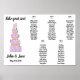 Elegant wedding cake theme seating chart poster, template text for five tables with guest names.