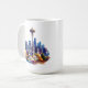 This ceramic coffee mug is shown in a beautiful watercolor art print of Seattle skyline.