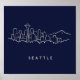 This design features a hand drawn sketch of the Seattle skyline on a dark blue background.