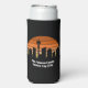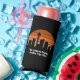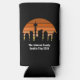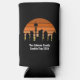 Cool customized Seattle trip seltzer can cooler featuring the city skyline at sunset. A silhouette of the city buildings in Washington, including the space needle above your personalized text for your family vacation.