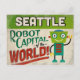 A funny Seattle Washington vintage travel postcard featuring a friendly robot with fun retro style text that says, "Seattle, Robot Capital of the world!"