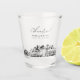 Modern Seattle skyline shot glass favour gift with "cheers" script. The design showcases a stunning sketch with the ability to customize your names and exact location. Enter the Zazzle design tool for additional customizations.