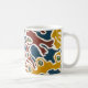 White mug decorated with a screenprinted pattern of seaweed.