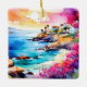 "Secluded Beach". A Secluded Mediterranean beach with a tranquil blue sea is framed by pretty pink and purple blooms. A quiet and relaxed place for contemplation.