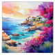 "Secluded Beach". A Secluded Mediterranean beach with a tranquil blue sea is framed by pretty pink and purple blooms. A quiet and relaxed place for contemplation.