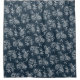 Chic shower curtain in dark navy blue features an allover pattern of white flower outline illustrations.