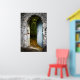 A portrait oriented image depicting a stone wall that is centuries old with a aged blue gate. The gate lies ajar revealing a glimpse of the lush garden and leafy undergrowth behind.