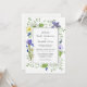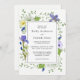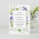 A wedding invitation with a lovely rustic boho-style, this design features wildflowers in mixed watercolor hues of purple, blue, yellow, and white with vine-like greenery as accents. The flowers surround a rectangular vertical frame with some petals spilling over the frame in carefree style. The reverse side of the invitation has a matching floral wreath with the bride and groom's initials in the centre. Personalize the sample text shown in the design template with your wedding details. If your text needs re-positioning after making your changes, simply slide it into place using your mouse or pointing device.