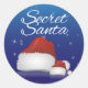 Secret Santa in white and blue with red pair of santa hats. A great idea for a secret santa party, shop or special event at the corporate office or in the community.