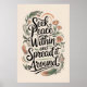 Discover a visually enchanting design that captures the essence of seeking peace within and spreading it around This harmonious artwork showcases soft earthy tones like dusty rose sage green and warm beige complemented by flowing typography with an organic handwritten feel Surrounded by delicate nature illustrations such as wildflowers feathers and mandalas gentle waves symbolize the spread of tranquillity Embrace this laid-back free-spirited vibe perfect for inspiring inner harmony