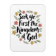 Modern Calligraphy typography design in black letters with colourful floral accents with quote, "Seek Ye First the Kingdom of God." Bible Scripture is from Matthew 6:33.