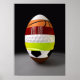 A segmented ovoid shaped ball with the different segments representing the sports of rugby, basketball, cricket, golf, tennis, soccer, and football
