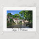 Carte postale avec le château et le pittoresque village historique de Segur-le-Château avec ses maisons à colombages le long de la rivière Auvézère dans le Limousin, France, avec une frontière blanche et le texte : "Ségur-le-Château".