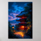 The artwork features a traditional Japanese temple glowing with lanterns against a breathtaking night sky filled with stars. From its hillside perch, the temple overlooks a city sparkling with lights, creating a peaceful and magical scene that blends ancient tradition with modern life.
