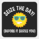 Seize The Day! (Before It Seizes You.) This is a cool funny gift for a man or woman who wants inspiration, but also has a sense of humour and enjoys sarcasm. Great motivational accessory for someone who laughs at sarcastic jokes. Features a cartoon graphic of a smiling sun with sunglasses.