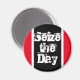 ROUND MAGNET with the inspiring happiness quote "Seize the Day" in stylish white text. Modern black, red and white vertical stripes design. AFFORDABLE GIFT for a friend or quote lover! Inspired from the film "Dead Poet's Society." ~ LAUREN ANTONINI DESIGNS