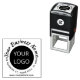 This fully customizable round self inking business or promotional rubber stamp has room for your custom logo in the middle of the circle. Add your business or company name, logo, return address, website or other information in the template. Simply replace the sample words with your own. The words form a circle around the logo.