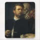 This design features a painting by the German artist Arnold Böcklin (1827–1901). It is a self-portrait of the artist with a figure representing death standing behind him. The deathly figure is a skeleton who is playing a haunting tune of a violin, the musical instrument also known as a fiddle. The artist is holding a paintbrush and a palette in his hands. The artist appears to be haunted by the realization that death is so close to him. The original artwork was painted by Arnold Böcklin in 1872.