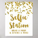 Selfie station sign poster for baby shower, bridal shower, or wedding in white and gold confetti pattern with handwritten style lettering. Perfect for a baby shower, wedding, or bridal shower.